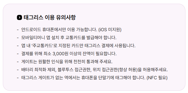 • 삼성월렛 등 타 앱 사용자: 삼성월렛, 토스 등 다른 앱에서 티머니 교통카드를 사용하더라도, 태그리스 기능을 쓰려면 모바일티머니 앱에서 별도 설정이 필요합니다.