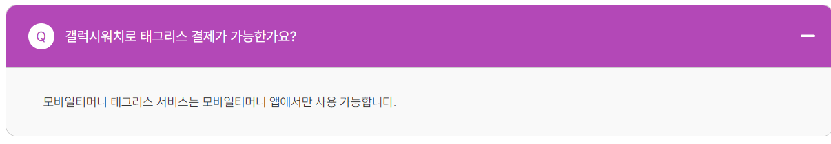 Q. 갤럭시 워치로도 태그리스 결제가 가능한가요? A. 아니요, 태그리스 서비스는 모바일티머니 '앱'에서만 사용 가능합니다. 워치로는 이용할 수 없습니다.