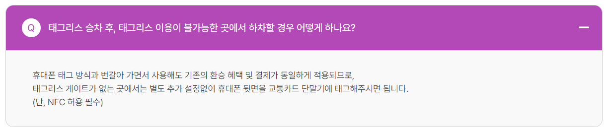 Q. 태그리스로 승차했는데, 내릴 곳에 태그리스 게이트가 없으면 어떡하나요? A. 걱정하지 않으셔도 됩니다. 기존 환승 혜택 및 결제가 동일하게 적용되므로, 별도 설정 없이 휴대폰 뒷면을 교통카드 단말기에 태그 해주시면 됩니다.