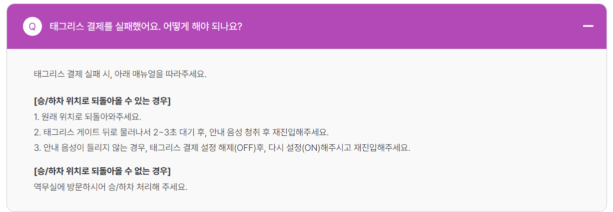 Q. 태그리스 결제가 실패했어요. 어떻게 해야 하나요? A. 우선 원래 승/하차 위치로 돌아가서 2~3초 뒤 다시 시도해 보세요. 안내 음성이 들리지 않으면 태그리스 설정을 껐다가(OFF) 다시 켠(ON) 후 재진입을 시도해 보세요. 만약 원래 위치로 돌아갈 수 없다면 역무실에 방문하여 처리해야 합니다.