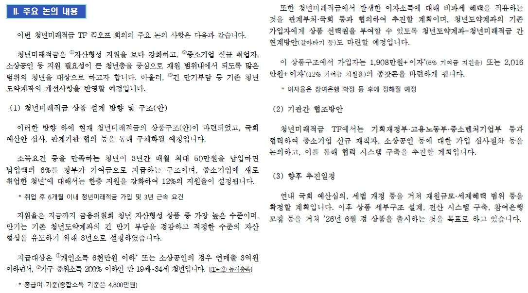Q. 신청은 언제, 어떻게 하나요? A. 2026년 6월 경 출시하는 것을 목표로 하고 있습니다. 지금은 상품의 큰 틀을 짜는 단계이며, 앞으로 전산 시스템 구축, 은행 모집 등의 절차가 남아있습니다. 신청방법과 심사 절차도 TF에서 논의하여 확정할 계획입니다.