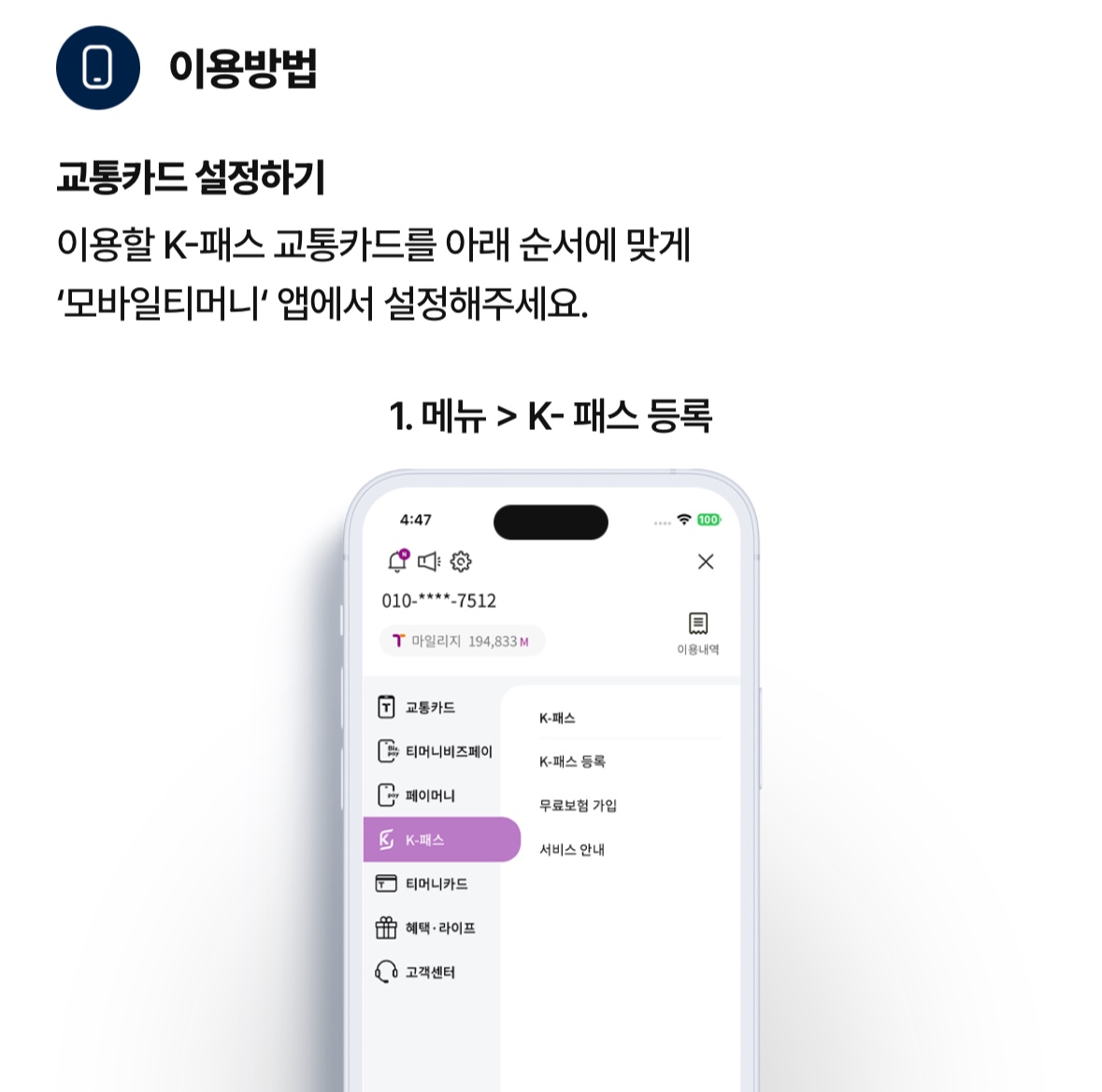 1단계: 모바일티머니 앱 설정 먼저 '모바일티머니' 앱을 켜고, 메뉴에서 K-패스 또는 K-패스 등록을 선택해 주세요.