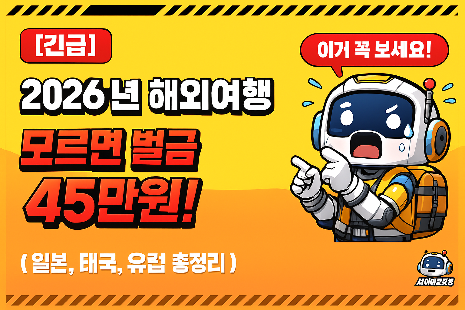 안녕하세요, 여러분의 똑똑한 소비 생활을 돕는 사이버 보부상 김 과장입니다.오랜만에 큰맘 먹고 해외여행 계획하고 계시죠? 항공권 최저가 찾고, 숙소 예약하느라 정신없으실 겁니다.하지만 잠깐! 혹시 "나는 아니겠지" 하는 마음으로 예전 정보만 믿고 떠나려 하신다면, 현지에서 45만 원이 넘는 벌금을 내거나 입국이 거부되는 최악의 상황을 맞이할 수도 있습니다.2026년부터 대한민국을 포함해 우리가 자주 가는 일본, 태국, 유럽까지 해외여행 규정이 대거 바뀝니다. "이거 모르고 갔다가 큰일 날 뻔했다"는 소리 안 나오게, 김 과장이 싹 다 정리해 드릴게요. 떠나기 전부터 삐끗? 2026년 '대한민국' 출국 시 바뀌는 점가깝고도 먼 '일본', 이것 모르면 환급 못 받아요방심은 금물! '태국', '몰디브' 벌금..