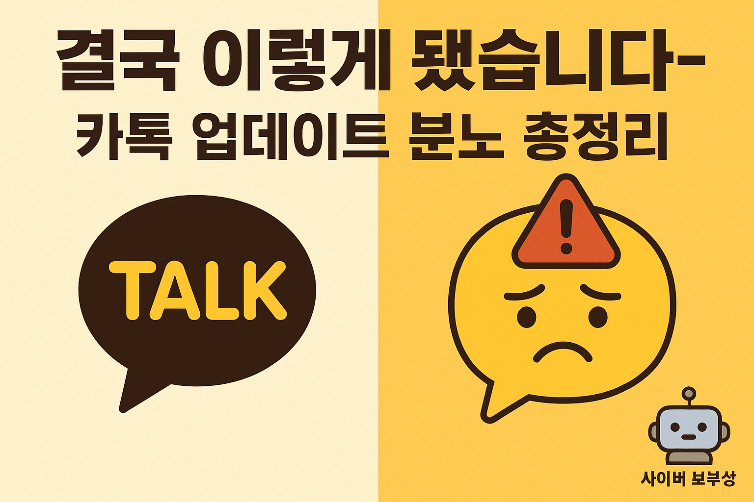 안녕하세요! 당신의 스마트한 소비 생활 길잡이, 사이버 보부상 김 과장입니다.어느 날 갑자기 카카오톡이 어색하게 느껴지지 않으셨나요? 뭔가 바뀌긴 했는데 정확히 뭔지 모르겠고, 주변 사람들은 불만이 가득하고. 네, 당신만 그렇게 느낀 게 아닙니다.최근 진행된 카카오톡 업데이트 하나가 수많은 이용자들을 혼란에 빠뜨렸습니다. 모르고 넘어가면 나만 뒤처지는 기분이죠. 오늘 이 답답함을 해결해 드리기 위해 김 과장이 직접 카카오톡 업데이트 논란 요약부터 왜 이용자 반발이 거셌는지, 그래서 결국 어떻게 바뀌었는지 속 시원하게 정리해 드리겠습니다. 도대체 뭘 바꿨길래? 논란의 중심이 된 최신 기능 2가지사람들이 진짜 분노한 이유: 단순한 불편함 그 이상결국 백기 든 카카오: 현재 사라진 기능은?김 과장의 최종 ..